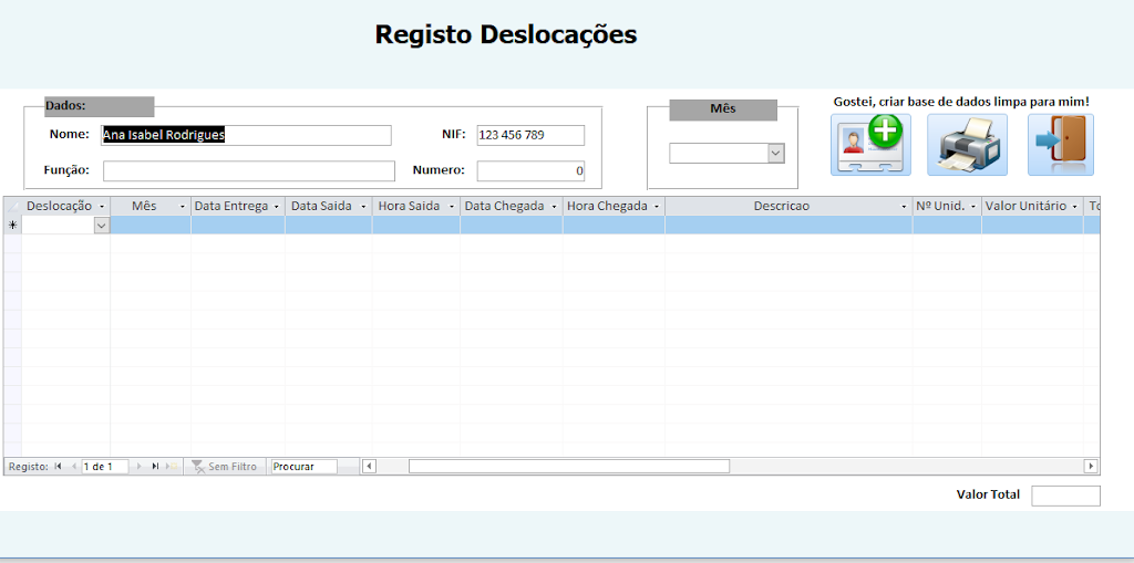 Registo/Mapa de Despesas de Deslocações com relatório no final.